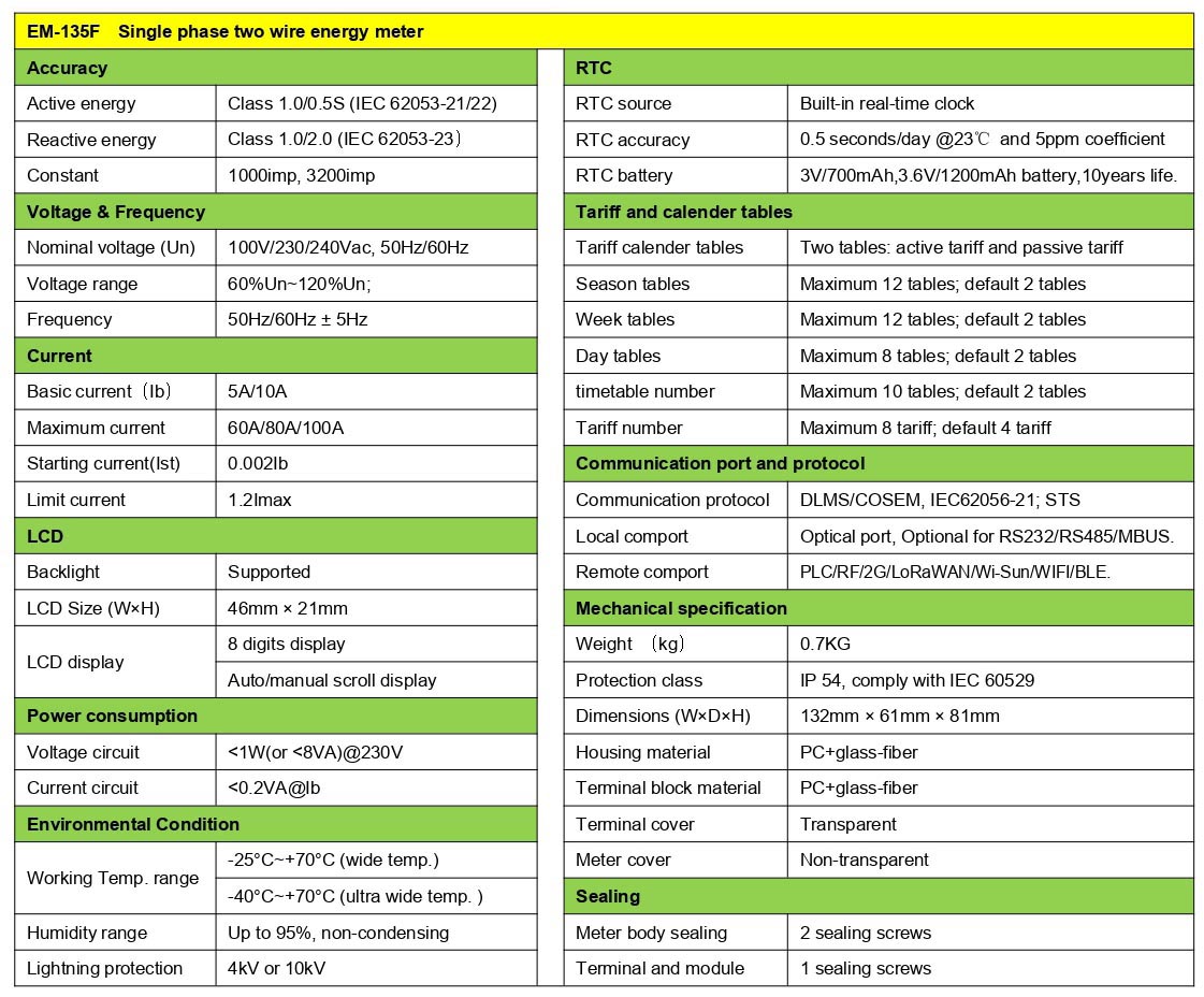 EM-135F is a direct connection and economic single phase 2-wire smart energy meter, which is used to measure electric energy accurately for commercial and residential customers. Meter supports varieties communication mediums for remote management and reading with hot swappable communication Optical module such as port+RS232/MBUS/RS485/PLC/RF/2G/LoRaWAN/Wi-Sun/WI FI/BLE etc.
