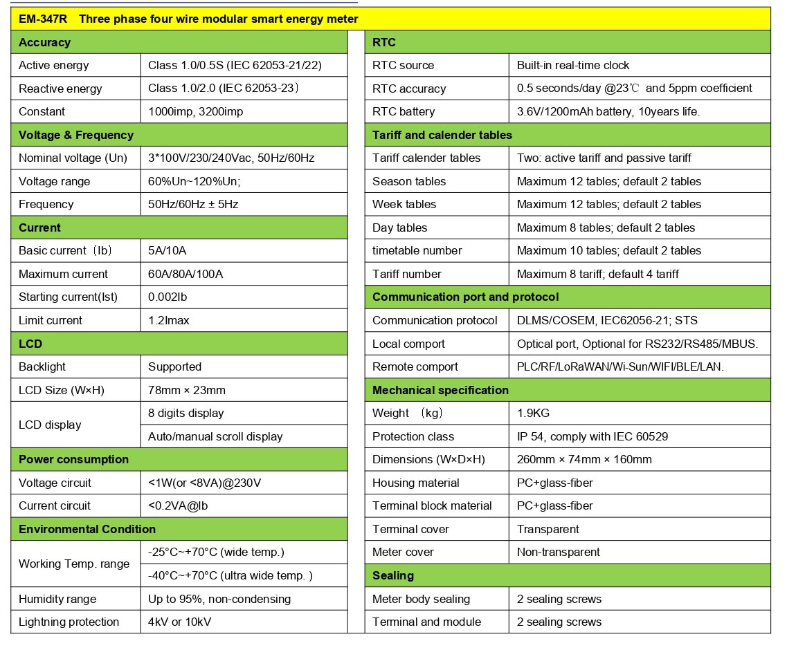 EM-347R is a direct connection modular design three phase AMI meter, which is used to measure electric energy accurately for commercial and residential customers. Meter supports varieties communication mediums for dala management with PLC/RF/Wi-Sun/LoRaWAN/WIFI/BLE and optical port/RS232/MBUS/RS485/LAN is for wire communication etc. DLMS/COSEM or IEC62056-21 protocol.