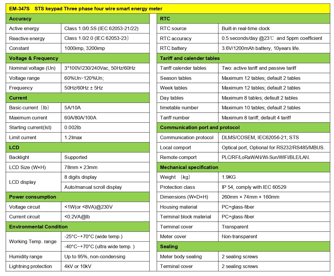 EM-347S is a direct connection design three phase STS prepaid and AMI meter, which is used to measure electric energy accurately for commercial and residential customers. Meter supports varieties communication mediums for data management with PLC/RF/2G/4G/Wi-Sun/LoRaWAN/WIFI/BLE/RS232/MBUS/RS485/LAN ports. DLMS/COSEM or IEC62056-21 protocol.
