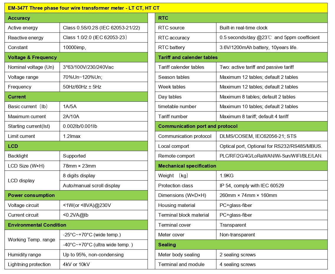 EM-347T is a direct connection modular design three phase AMI meter which is used to measure electric energy accurately for commercial and residential customers. Meter supports varieties communication mediums for remote management with hot swappable communication module, such as PLC/RF/2G/4G/Wi-Sun/LoRaWAN/WIFI/BLE and optical port/RS232/MBUS/RS485/LAN is for wire communication etc. And the battery is also replaceable.